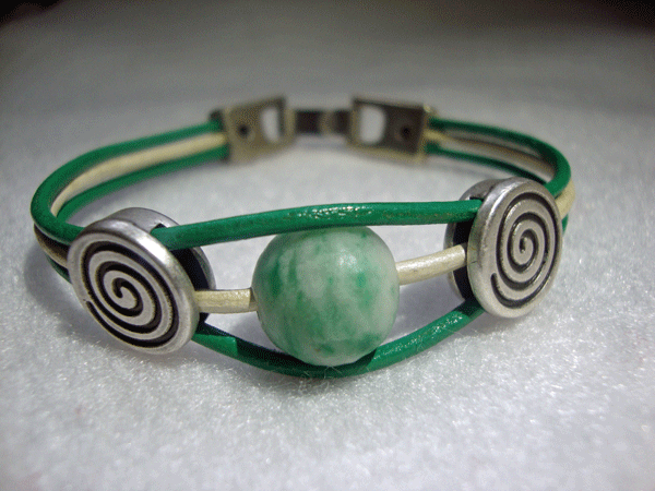 Lleva un cordon de cuero y cierre de metal.La bola negra está aliñada con Alambre de Aluminio